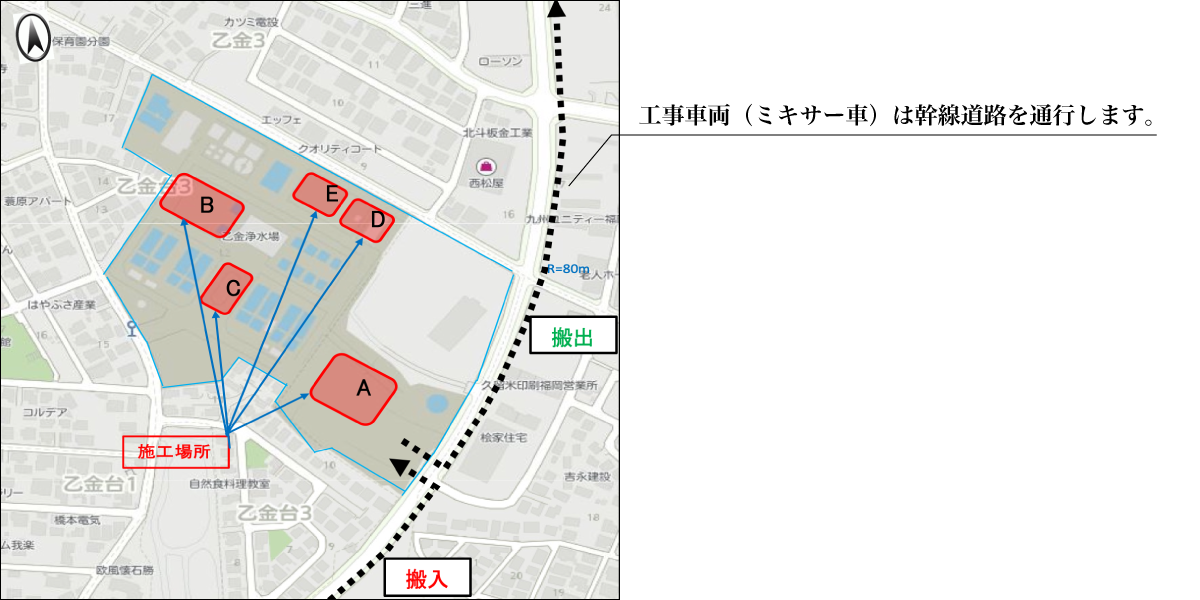 現在、乙金浄水場内で5施設(A~E施設)の築造工事を進めておりますが、令和4年1月~6月において、大規模な構造物のコンクリート打設を昨年に引き続き予定しております。