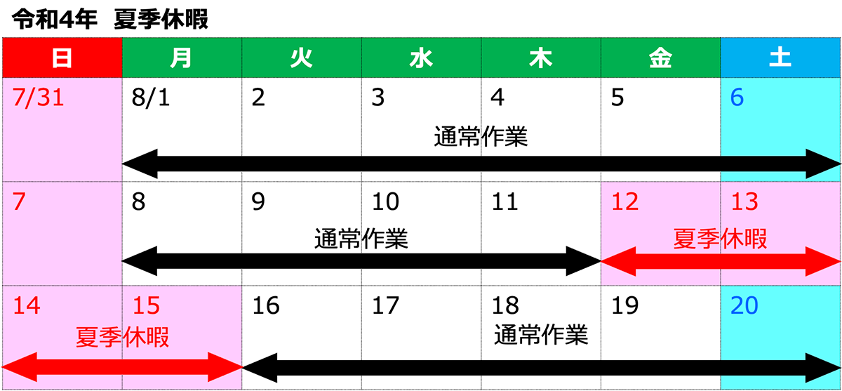 令和4年8月12日(金)から令和4年8月15日(月)まで夏季休暇とさせていただきます。