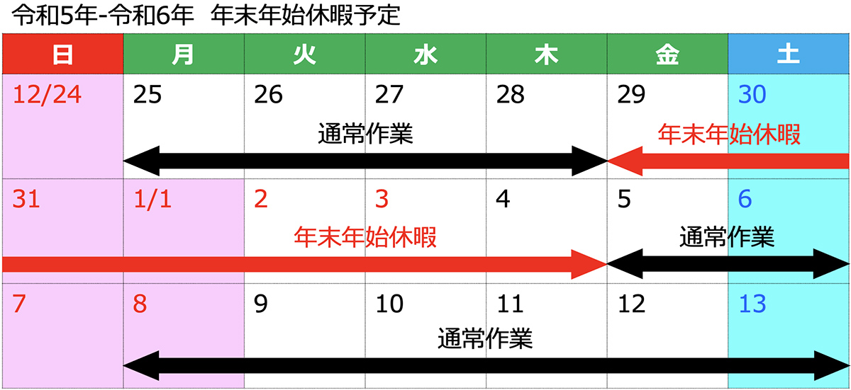 令和5年12月29日(水)から令和6年1月4日(木)まで年末年始休暇とさせていただきます。