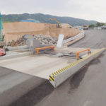 ダンプトラックに付着した土が周辺道路を汚さないよう、場内出入り付近にタイヤ洗浄設備を設置しています。