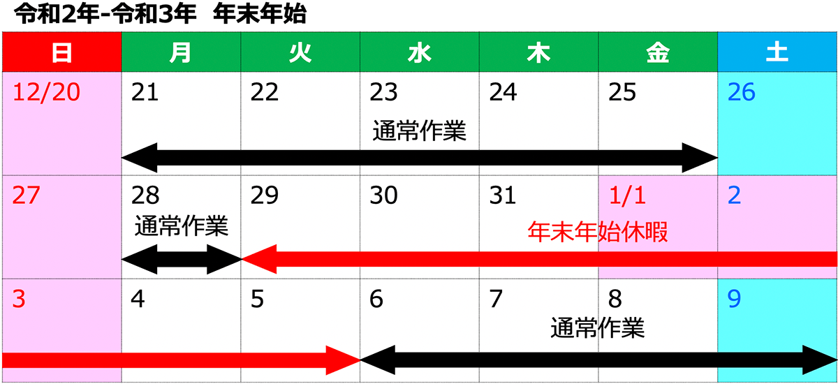 令和2年12月29日(火)から令和3年1月5日(火)まで年末年始休暇とさせていただきます。
